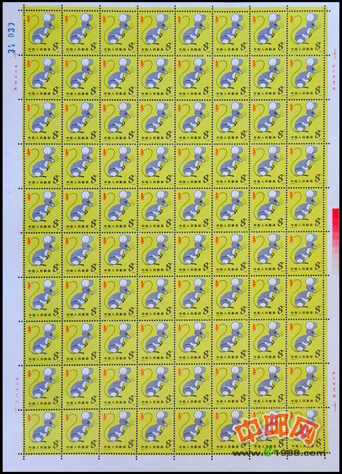 这枚生肖邮票由著名漫画家和动画设计师詹同设计,他采用了夸张和变形等手段,把一般人望而生厌的老鼠处理得稚气、活泼、灵巧可爱。