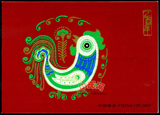 2005年是农历乙酉年,即鸡年。第三轮生肖邮票的第二套。鸡是十二生肖中唯一禽类,古人誉鸡为德禽,因其有五德:“头戴冠,文也;足搏距,武也;敌前敢斗,勇也;见食相呼,仁也;守夜不失时,信也”。刚柔并济的“鸡三世”采用了绘画、剪纸(鸡颈部)、刺绣(头部、牡丹花)、书法等多种手法,使人看了有美不胜收之感,鸡冠、红日、鲜花显示了新欢乐、祝福、传情的热烈气氛。雄鸡高唱,旭日东升,霞光满天、寓意乙酉鸡年吉祥如意、朝气蓬勃、蒸蒸日上。