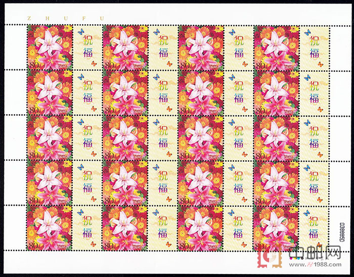 邮票规格:30mm×30mm 附票规格:20mm×30mm或30mm×20mm 每版20枚,附票带有“祝福”字样图案。 这版邮票在印制中使用了香味油墨,刮擦后散发出百合花的香味。这是中国邮政发行的第一枚香味邮票,附票带有“祝福”字样图案。 中邮网出售的所有个性化邮票、个性化小版票均保真保品相,请放心购买!