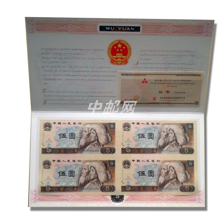 第四套人民币5元券四方联连体钞,是中华人民共和国法定货币,由中国人民银行发行。该连体钞由4张未裁切的第四套人民币5元券构成。中国人民银行授权北京康银阁钱币有限责任公司装帧,每套装帧量40万套。