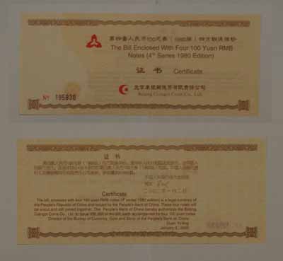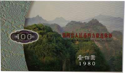 第四套人民币100元券(1980版)四连体钞,是中华人民共和国法定货币,由中国人民银行发行。该连体钞由4张未裁切的第四套人民币100元券(1980版)构成。中国人民银行授权北京康银阁钱币有限责任公司装帧,装帧量20万套。