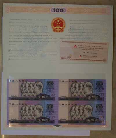 第四套人民币100元券(1980版)四 连体钞由四张未裁切的第四套人民币1980年版100元构成,是中华人民共和国法定货币。