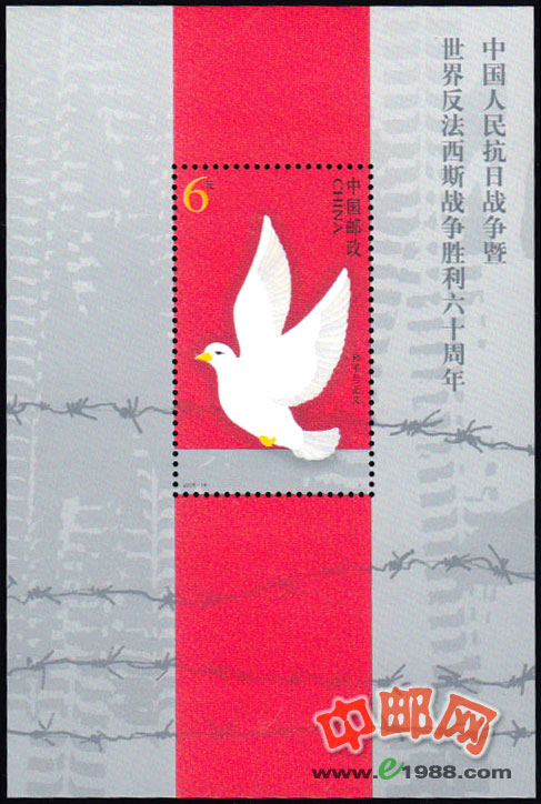 国家邮政局定于2005年8月15日发行《中国人民抗日战争暨世界反法西斯战争胜利六十周年》纪念邮票1套4枚,小型张1枚。