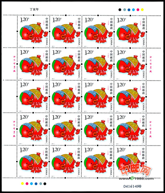 国家邮政局1月5日发行《丁亥年》特种邮票1套1枚,面值1.20元。这是中国发行的第三轮生肖邮票中的第四套。邮票图案为一头戴头巾、披肩,憨态可掬的猪妈妈,用慈祥的目光看着猪宝宝。