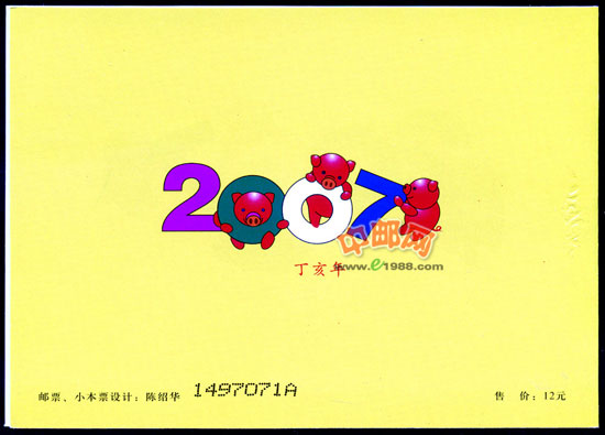 2007年是农历丁亥年,即猪年。第三轮生肖票的第四套。一年春作首,六畜为先。猪是人类的好朋友,与人类的关系最为密切,它的一身都是宝。邮票画面以平面的手法模拟木偶漆器玩具的立体感,表现了猪的憨态可掬的形态。猪妈妈慈祥地守护着自己的孩子,猪妈妈的形象充满个性与人性的光彩,洋溢着亲情的温馨。体现了“家和万事兴”,表达了中国传统的“和”文化,即“和谐”、“和睦”、“和气生财”等。画面用大红色为基调,营造了吉祥喜庆的气氛,可喻为当今“红红火火”的国力发展。并同时发行小本票。