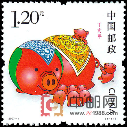 2007年是农历丁亥年,即猪年。第三轮生肖票的第四套。一年春作首,六畜为先。猪是人类的好朋友,与人类的关系最为密切,它的一身都是宝。邮票画面以平面的手法模拟木偶漆器玩具的立体感,表现了猪的憨态可掬的形态。猪妈妈慈祥地守护着自己的孩子,猪妈妈的形象充满个性与人性的光彩,洋溢着亲情的温馨。体现了“家和万事兴”,表达了中国传统的“和”文化,即“和谐”、“和睦”、“和气生财”等。画面用大红色为基调,营造了吉祥喜庆的气氛,可喻为当今“红红火火”的国力发展。并同时发行小本票。