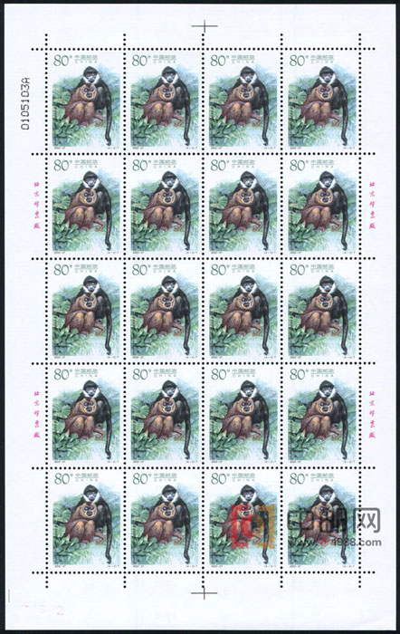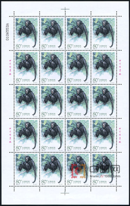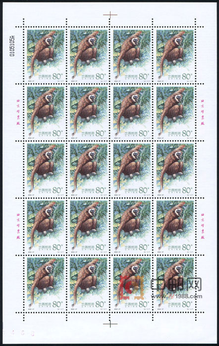 ZBP-2002-27 长臂猿(整版票),四张一版,一版20套票,上品。由于票幅较大,边纸可能会有少许小软折,属正常现象。购买请仔细查看大图。