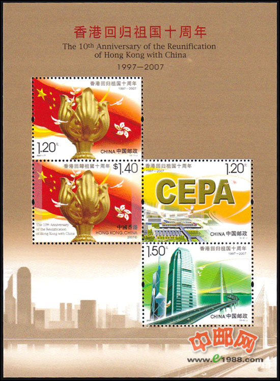 注:此为国家邮政局与香港邮政署共同印制的同题材小全张,内含国家邮政局发行的邮票3枚和香港邮政署发行的邮票1枚。