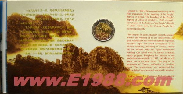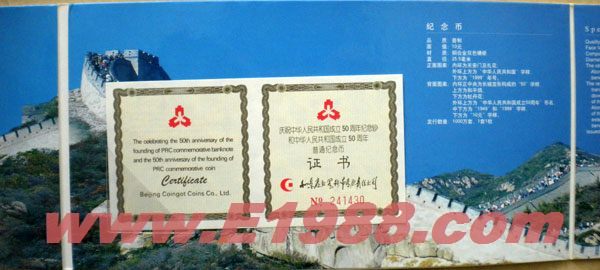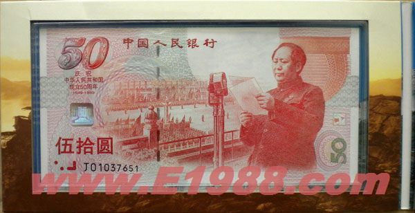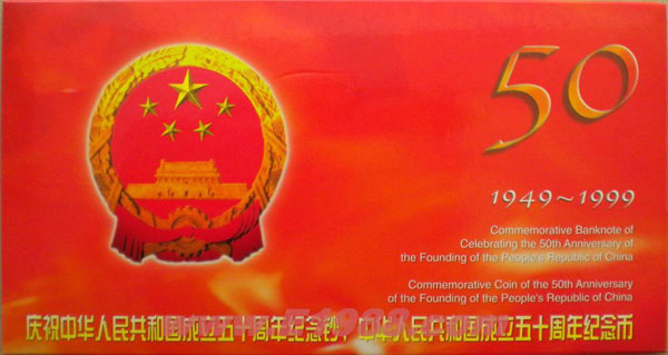 内含中华人民共和国成立50周年纪念钞、纪念币各一枚,