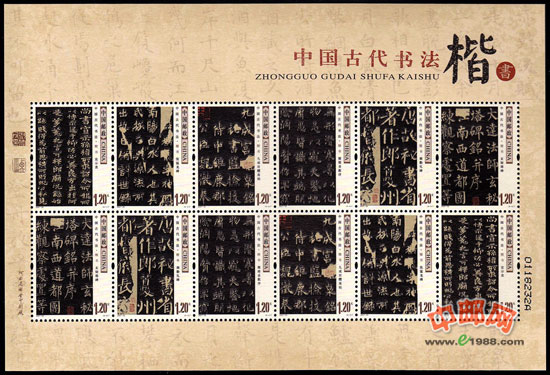 2007年11月15日,国家邮政局发行“中国古代书法——楷书”特种邮票一套6枚,主图分别为“宣示表 ”、“张猛龙碑”、“九成宫醴泉铭”、“雁塔圣教序”、“颜勤礼碑”和“玄秘塔碑 ”,面值均为1.2元。资料提供:故宫博物院、曲阜市文物管理局、西安市大雁塔保管所、上海博物馆。