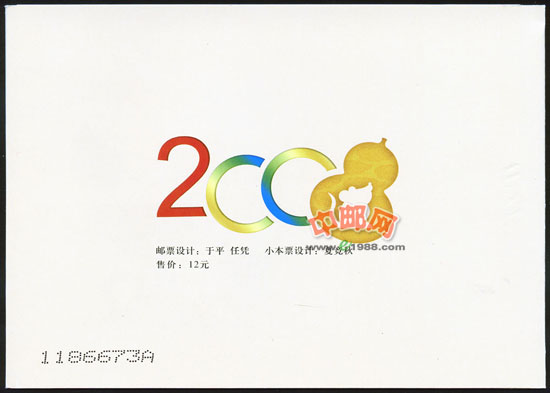 2008年是农历戊子年,即鼠年。第三轮生肖票的第五套。鼠是一种有灵性的动物,是顽强生命力和财富的象征。自古就有“鼠咬天开”的动人传说和“鼠送谷种”、“鼠嫁火种”、“鼠送光明”等故事。鼠在人们心目中是一种人文性动物,所画之鼠会像人一样站立行走、穿红戴绿、敲锣打鼓、娶亲嫁女。戊子年邮票的鼠姑娘打扮得花枝招展,漂亮又活泼可爱。高翘的嘴巴、灵动的眼神、卷曲的长尾巴,令人联想到“鼠咬天开、鼠上灯台”等吉祥趣味的故事。佛手、百合花和花盆把生肖鼠衬托得更加漂亮。寓意“美满多福、富贵满盆、百事和谐”的新年美好祝福。生动的造型、亮丽的色彩、精妙的意境,使画面充满了喜庆、和谐和吉祥的气氛。并同时发行小本票。
