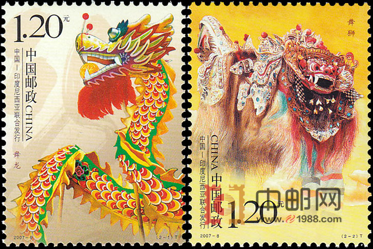 舞狮是印尼巴厘岛的传统表演活动,以讲述故事的形式,将一千多年前的古代神话以生动的戏剧性演绎表现善恶的对抗,是印尼巴厘岛人民表现古代神话的典型代表。中国邮政从上世纪九十年代开始与外国邮政联合发行纪念邮票。首套中外联合发行的纪念邮票是