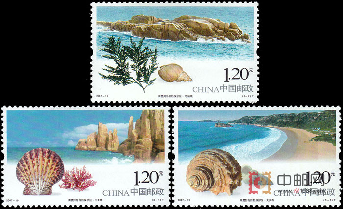 【图案面值】(3-1)T 三盘尾 1.20元(3-2)T 龙船礁 1.20元(3-3)T 大沙岙 1.20元 邮票介绍: 2007年7月10日,国家邮政局发行“南麂列岛自然保护区”纪念邮票一套3枚,主图分别为“三盘尾”、“龙船礁”和“大沙岙”,面值均为1.2元。历史背景: 南麂列岛位于浙江省平阳县东南海域,面积19600公顷,1989年经平阳县人民政府批准建立,1990年被批准为国家级,主要保护对象为海洋贝藻类及生态环境。本区地处台湾暖流与江浙沿岸流交汇和交替消涨的海区,属亚热带海洋季风气候。区内海洋生物物种繁多,区系成分复杂,自然生态系统保存良好。 自然保护区已鉴定的海洋贝类有403种,其中19种为国内首次记录,海洋底栖藻类有174种,其中黑叶马尾藻为世界海洋藻类的新种,贝藻类种数约占全国的29% 以上。本区的贝藻类不仅种类丰富,而且还具有温、热带两种区系特征和地域上的断裂分布现象,堪称我国近海贝藻类的一个重要基因库。