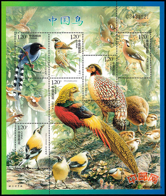 国家邮政局发行的“中国鸟”特种邮票,一套6枚,分别为台湾蓝鹊、藏鹀、黄腹角雉、黑额山噪鹛、红腹锦鸡、白尾地鸦,面值均为1.20元。该套邮票整张的整张设计成了小版张形式,为影写版,采用防伪纸张、防伪油墨和荧光喷码三种防伪方式,设计者是是我国著名邮票设计家、画