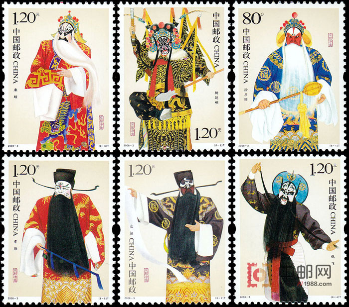 2008年2月23日发行《京剧净角》特种邮票1套6枚。