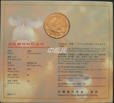 ZZB-25 中国珍稀野生动物金丝猴纪念币(钱币学会装帧)发行未配证书