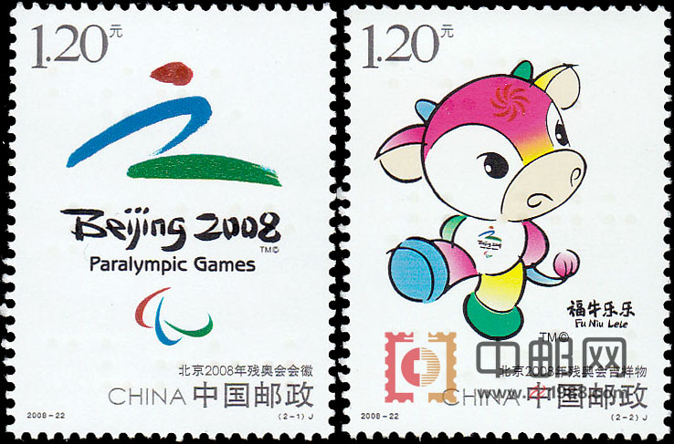 【图案面值】(2-1)J 北京2008年残奥会会徽 1.20元(2-2)J 北京2008年残奥会吉祥物 1.20元 邮票介绍: 2008年9月6日发行《北京2008年残奥会》纪念邮票1套2枚。