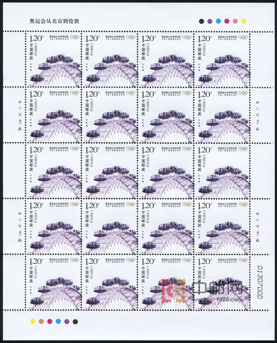 ZBP-2008-20 奥运会从北京到伦敦(中国和英国联合发行)(整版票),四张一版,一版20套票,全品。由于票幅较大,边纸可能会有少许小软折,属正常现象。购买请仔细查看大图。邮票介绍: 2008年8月8日发行《北京2008年奥林匹克博览会开幕纪念》纪念邮票1套2枚,小型张1枚。