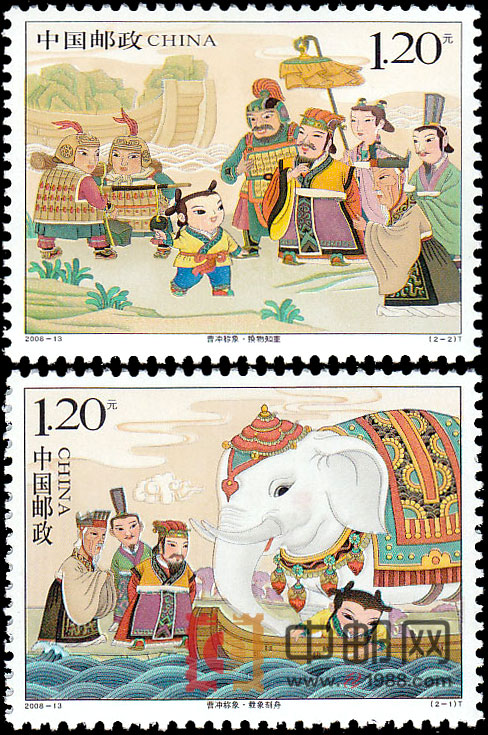 2008年6月1日发行《曹冲称象》特种邮票1套2枚,小本票(不干胶品种)1本。