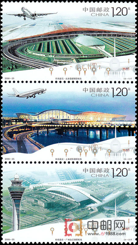 【图案面值】 (3-1)T 北京首都国际机场 1.20元(3-2)T 上海浦东国际机场 1.20元(3-3)T 广州白云国际机场 1.20元邮票介绍: 2008年9月28日发行《机场建设》特种邮票1套3枚。