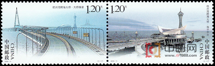 【图案面值】(2-1)T 大桥雄姿 1.20元(2-2)T 海中平台 1.20元邮票介绍: 杭州湾跨海大桥是一座横跨中国杭州湾海域的跨海大桥,它北起浙江省嘉兴市海盐郑家埭,南至宁波市慈溪水路湾。它是沈海高速公路的一部分,全长36公里,是世界上最长的跨海大桥。杭州湾跨海大桥2002年经国家计委批准立项,2003年6月8日奠基,2007年6月26日全线贯通,2008年5月1日建成通车。通车后大大缓解了已经拥挤不堪的沪杭和杭甬高速公路和压力。