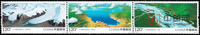 【图案面值】(3-1)T 各拉丹冬 1.20元(3-2)T 鄂陵湖 1.20元(3-3)T 扎曲 1.20元邮票介绍: 三江源地区位于我国西部、青藏高原腹地、青海省南部,为长江、黄河和澜沧江的源头汇水区。三江源自然保护区成立于2000年8月19日。 邮票画面:固态的水--雪山冰川;气态的水--朵朵白云;液态的水--湖泊河流。