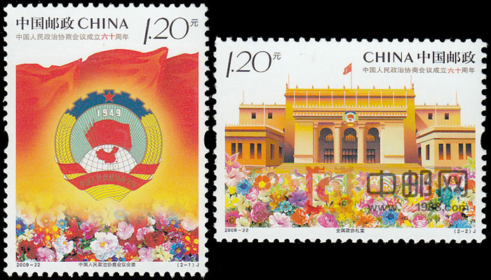 【图案面值】(2-1)J 中国人民政治协商会议会徽 1.20元(2-2)J 全国政协礼堂 1.20元邮票介绍: 1949年中国人民政协协商会议第一届全体会议在北平隆重举行,宣告中国人民政协协商会议正式成立。中国人民政协协商会议是中国人民爱国统一战线的组织,是中国共产党领导的多党合作和政治协商的重要机构,是中国政治生活中发扬社会主义民主的一种重要形式。