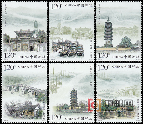 该套票上刻画有京杭大运河在源头和流经地区的标志建筑物图案,分别为北京通州的燃灯佛舍利塔、天津的天后宫、山东济宁的山陕会馆、江苏淮安的清江闸、江苏扬州的文峰塔、浙江杭州的拱宸桥,以及一枚以千里通波内容的小型张。