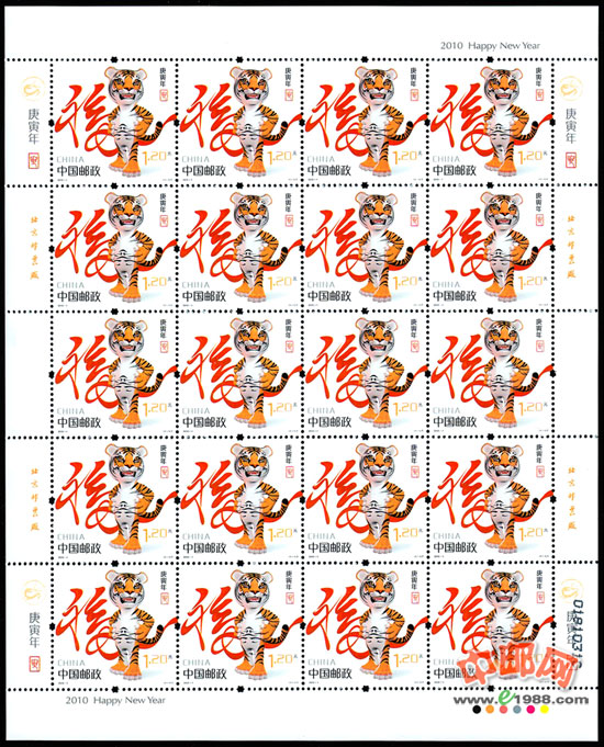 2010年是农历庚寅年,生肖虎年。中国邮政将于2010年1月5日发行《庚寅年》特种邮票,一套1枚面值120分,同时发行小本票。
