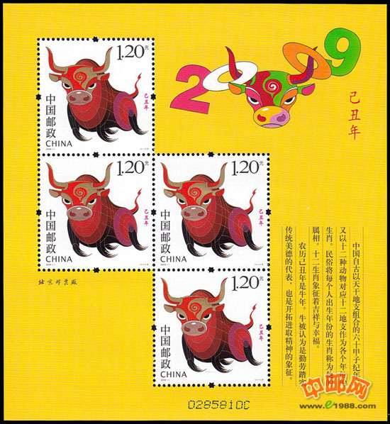 2009年是农历己丑年,即牛年。第三轮生肖票的第六套。中国人爱牛、尊牛、敬牛。传统十二生肖中,“牛”代表勤劳致富、幸福安康、寓意脚踏元宝、身背如意,驮拉财富。“牛年”蕴含事业兴旺、风调雨顺、五谷丰登。此枚邮票画面表现一头双目怒视、撒蹄狂奔、健壮倔强的雄牛,风驰电掣般地向我们飞驰而来,借以表达中国对改革开放的决心—无论征途有多少艰难险阻,那坚定的信念、顽强的意志,必将势不可挡、勇往直前。雄牛的双目直视前方,充满牛劲,霸气十足,表达了新一年的希望。并同时发行小本票。