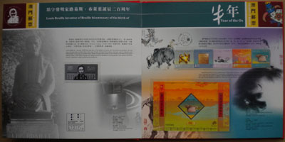 1、点字发明家刘易斯·布莱叶诞辰二百周年2、牛年3、观音开库4、传统工具二5、中国内地景观三6、国际劳动节120周年7、成语故事三8、中华人民共和国成立六十周年9、中西文化交汇艺术作品10、澳门培正中学校一百二十周年11、澳门科学馆落成12、澳门回归祖国十周年13、中国人民解放军驻澳门部队进驻十周年