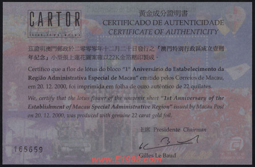 澳门2000rh 特区成立一周年纪念(金箔小型张)
