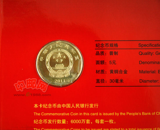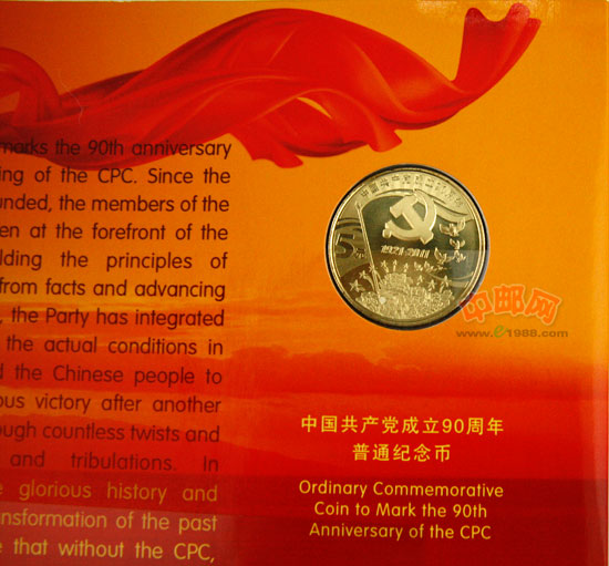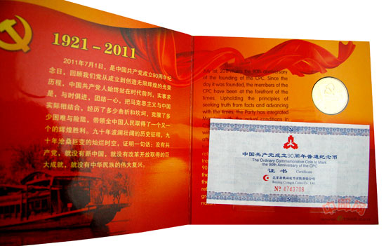 90周年”字样,下方刊“1921-2011”字样。内缘左侧刊“5元”字样。中国人民银行授权北京康银阁钱币有限责任公司装帧,