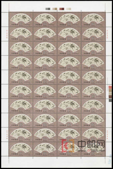 郑板桥的作品除红色印章外,均以水墨作画,不施粉底。为力求符合郑板桥的气质、风格,设计者选用古色古香、偏暖色调的绫子作衬底,每幅画面的底色也相应加以调整,古朴又典雅。在整套邮票的排列上,中心是竖幅立轴,两边则以册页、扇面对称,向左右延伸,在排列上形成音律的节奏感。