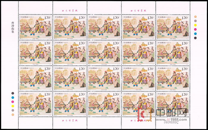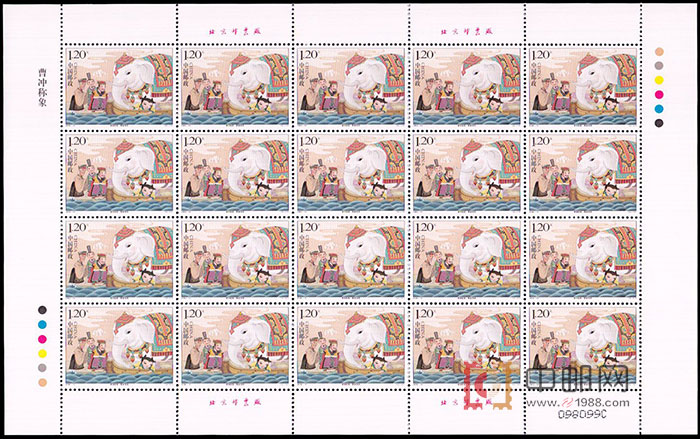 ZBP-2008-13 曹冲称象(整版票),两张一版,一版20套票。全品,由于票幅较大,边纸可能会有少许小软折,属正常现象。购买请仔细查看大图。 邮票介绍: 2008年6月1日发行《曹冲称象》特种邮票1套2枚,小本票(不干胶品种)1本。