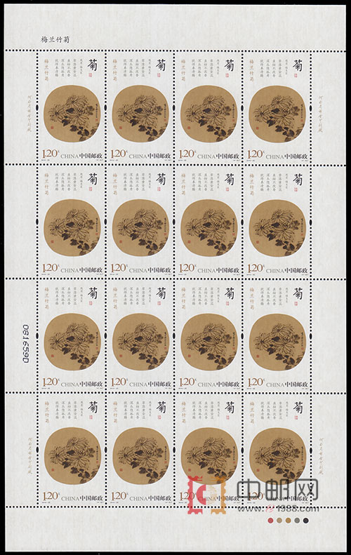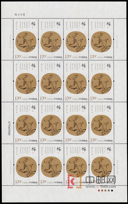 记者了解到,此次中国邮政发行的特种邮票“梅兰竹菊”,分别面值1.20元。除传统的16枚版式,还将出包含2套邮票面值9.60元的小版张,另外,为配合2010北京国际邮票钱币博览会举行,另制作扇形的《梅兰竹菊》小版张无齿邮票,均限量发行。
