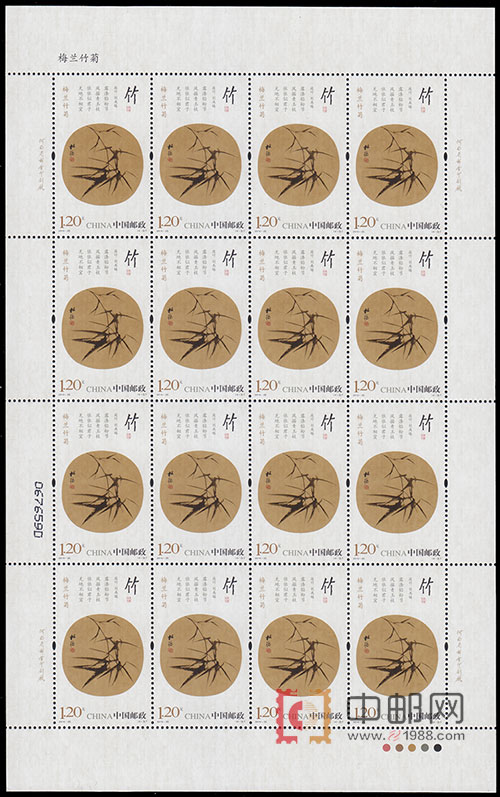 该套邮票表现的的梅花、兰花、竹、菊花,被人称为 “四君子”,分别面值1.20元。梅高洁傲岸,兰幽雅空灵,竹虚心有节,菊冷艳清贞,共同特点是自强不息,清华其外,澹泊其中,不作媚世之态。正是根源于对这种审美人格境界的神往,以深厚的民族文化精神为背景,梅、兰、竹、菊成为中国人民感物喻志的象征,也是咏物诗和文人画中最常见的题材。