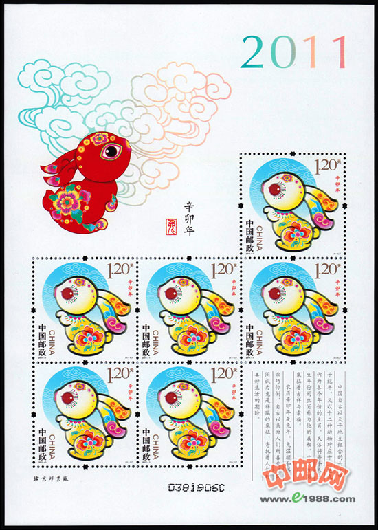 我国生肖邮票设计体现了“生肖情、文化味、艺术美、新年喜”的丰富内容。生肖邮票兔造型稚拙可爱、扑腾欲走,周身布满花卉图案,具有典型的民间剪纸特征,背景中有机融入蓝色月亮的造型,蕴含着我国古代月宫玉兔的美丽神话传说。