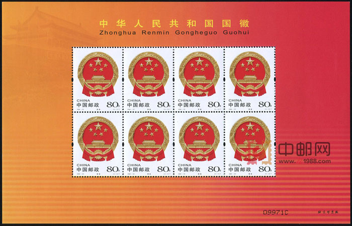 ZBP-2004-23 中华人民共和国国旗国徽(整版票),两张一版,一版8套票。全品,由于票幅较大,边纸可能会有少许小软折,属正常现象。购买请仔细查看大图。