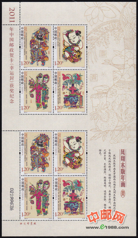 RM660 2011年中国邮政贺年有奖明信片(幸运封)获奖纪念--凤翔木版年画(丝绸)小版票(2011年)
