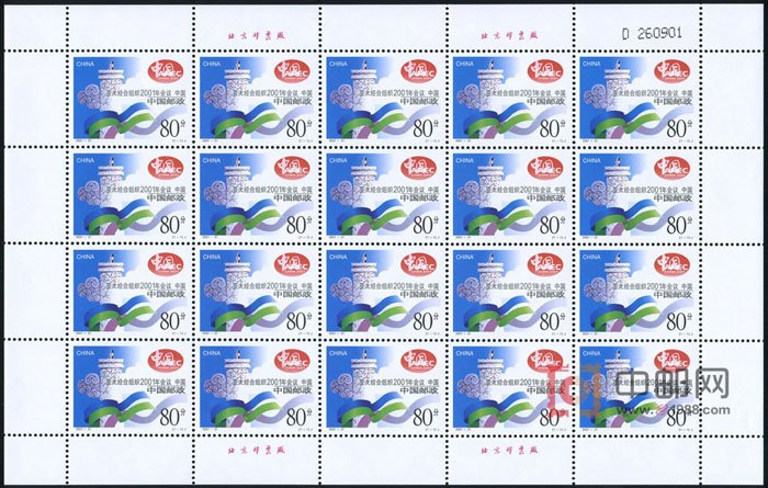 ZBP-2001-21 亚太经合组织2001年会议 中国(整版票),一张一版,一版20套票,全品,由于票幅较大,边纸可能会有少许小软折,属正常现象。购买请仔细查看大图。