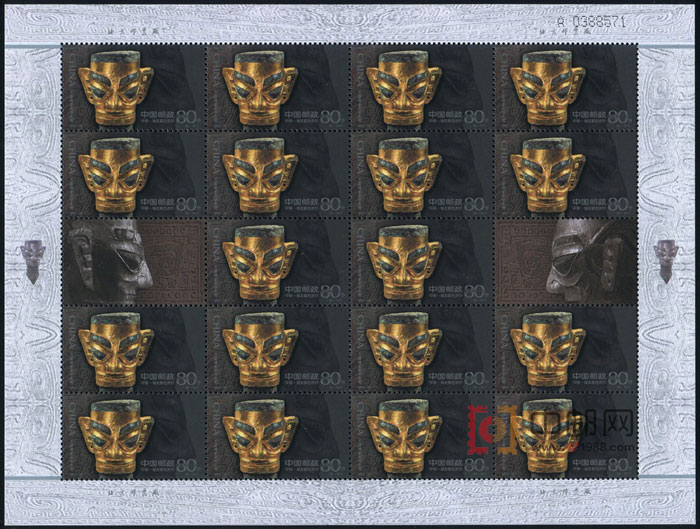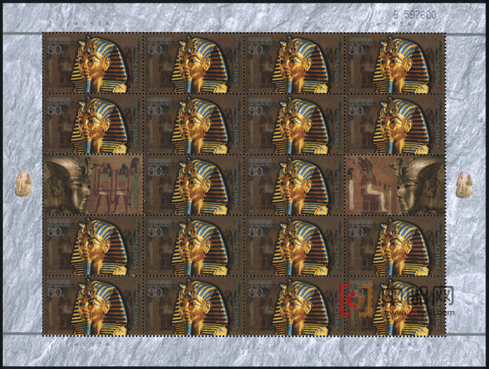 ZBP-2001-20 古代金面罩头像(中国和埃及联合发行)(整版票),两张一版,一版18套票,全品,由于票幅较大,边纸可能会有少许小软折,属正常现象。购买请仔细查看大图。