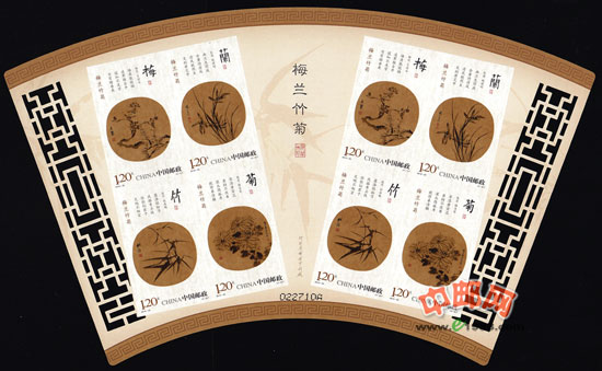 记者了解到,此次中国邮政发行的特种邮票“梅兰竹菊”,分别面值1.20元。除传统的16枚版式,还将出包含2套邮票面值9.60元的小版张,另外,为配合2010北京国际邮票钱币博览会举行,另制作扇形的《梅兰竹菊》小版张无齿邮票,均限量发行。