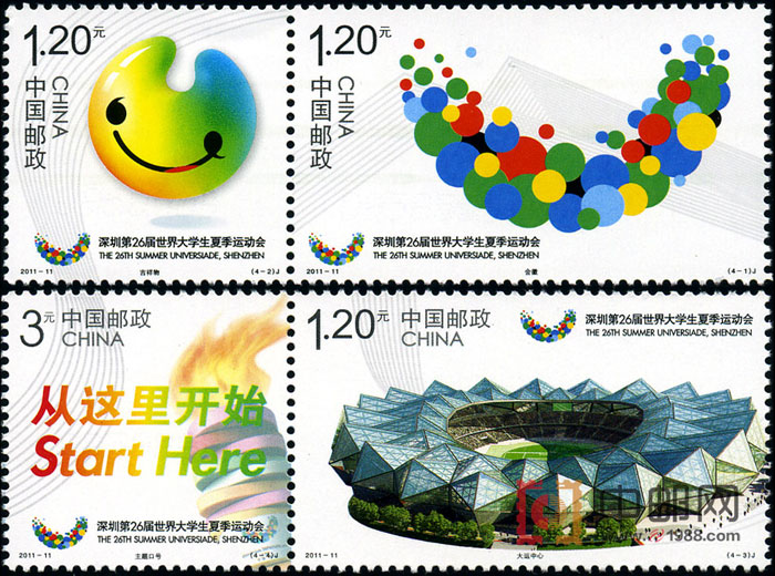 我国曾发行“第21届世界大学生运动会”和“第24届世界大学生冬季运动会”邮票各1套。2011年将发行的邮票内容拟表现会徽、吉祥物、主场馆、主题口号等内容。