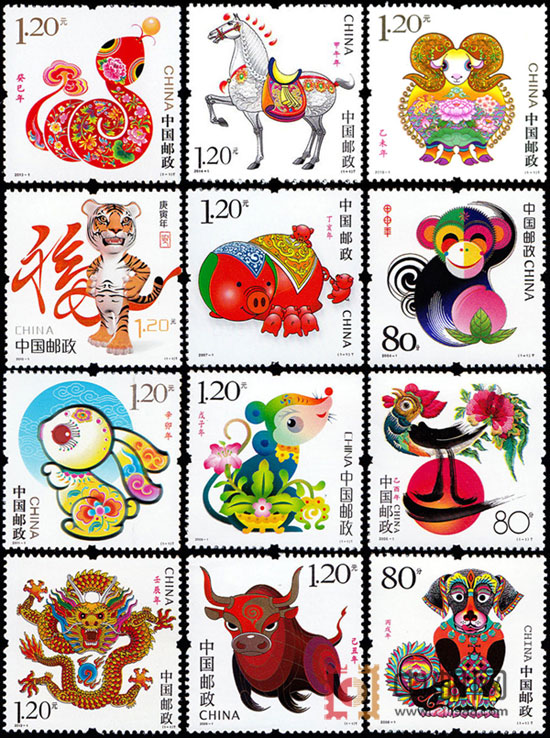第三轮生肖邮票全套,全部带荧光喷码,包含以下所列生肖票: