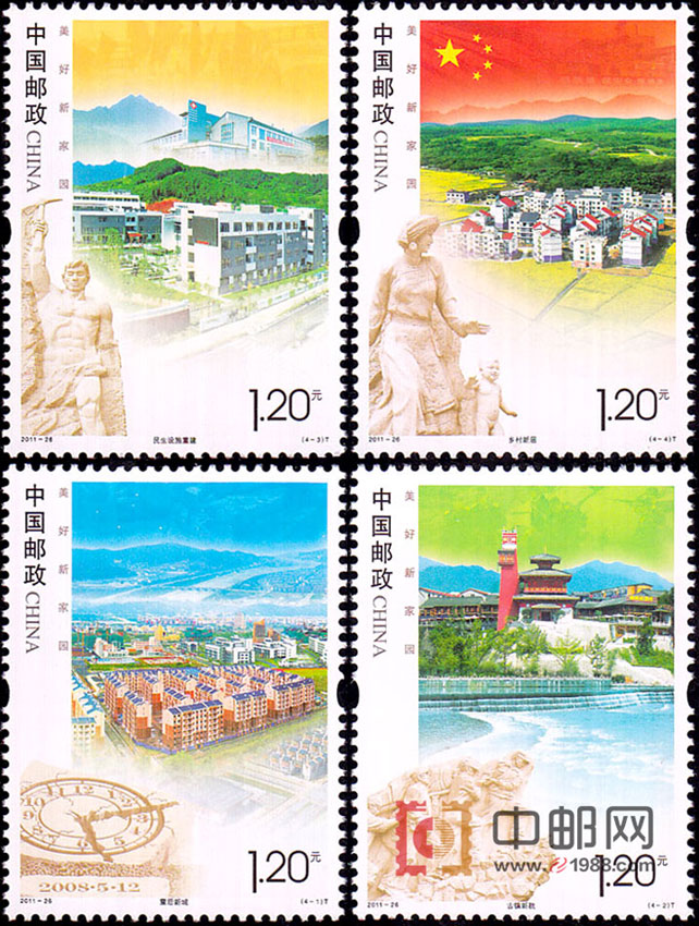 《美好新家园》特种邮票1套4枚,小型张1枚。邮票图名分别为:“震后新城”“古镇新貌”“民生设施重建”“乡村新居”,小型张图名为:“美好新生活”。