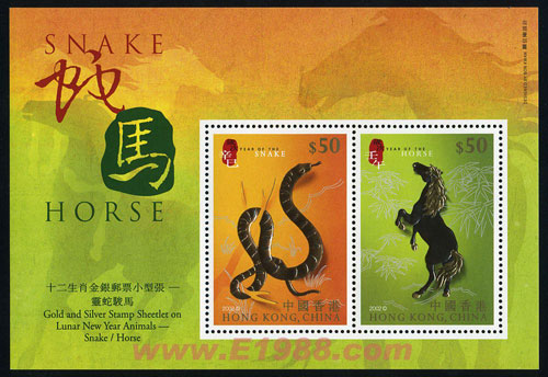 HK0387 JS3 十二生肖金银邮票小型张--灵蛇骏马(小型张)(2002年)