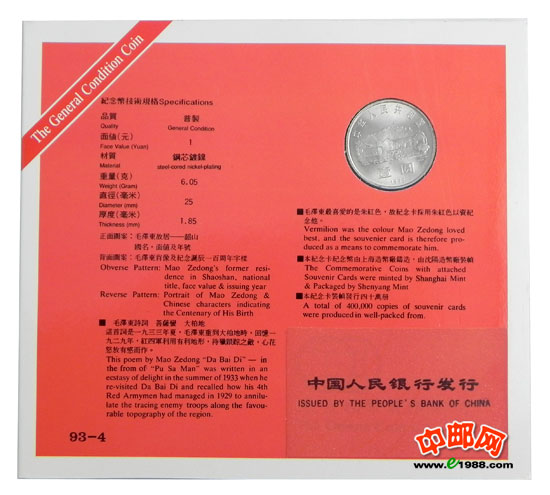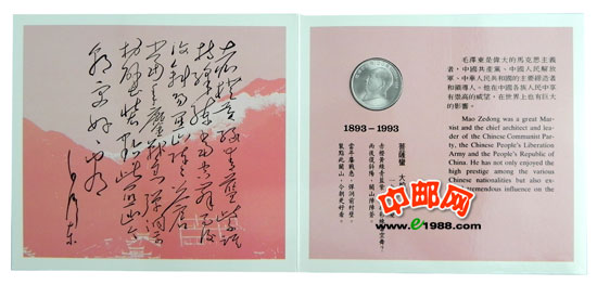 ZZB-10 毛泽东诞辰100周年纪念币(沈阳造币厂装帧)发行未配证书