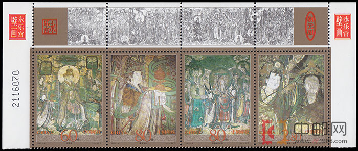 - 商品详情: 永乐宫建于元代,为道教宫观,位于山西省芮城县城北的古魏国遗址内。1959年修建三门峡水电站时从城西南永乐镇移建于此。三清殿是永乐宫的主要建筑,殿周四壁绘有精美的大型壁画——《朝元图》,面积达403平方米,形象生动地表现了道教神祇的群像。壁画色彩绚丽,线条流畅,动静相参,气势恢弘,是我国绘画史上的杰作。《永乐宫壁画》邮票图案均为《朝元图》局部。