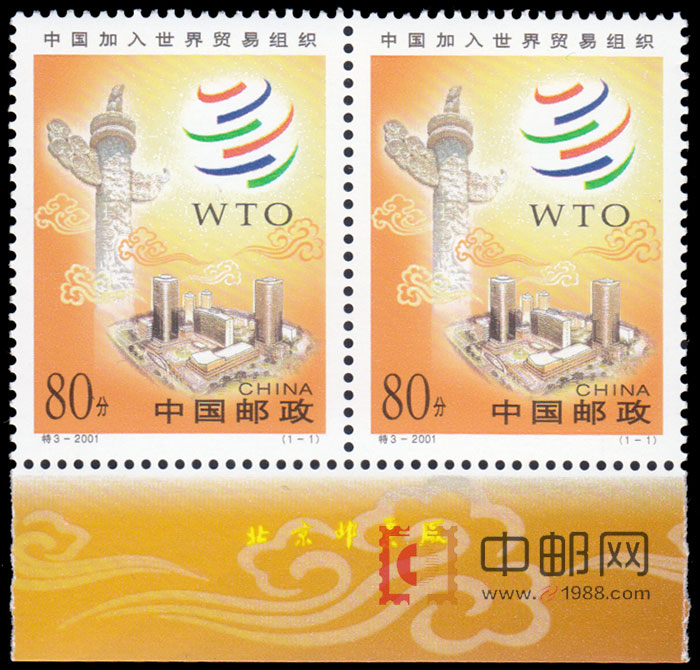 注明:2001特3 中国加入世界贸易组织是2套票,因版式原因决定,如果是单套票那厂铭仅有一半,因此这套票是双连票!